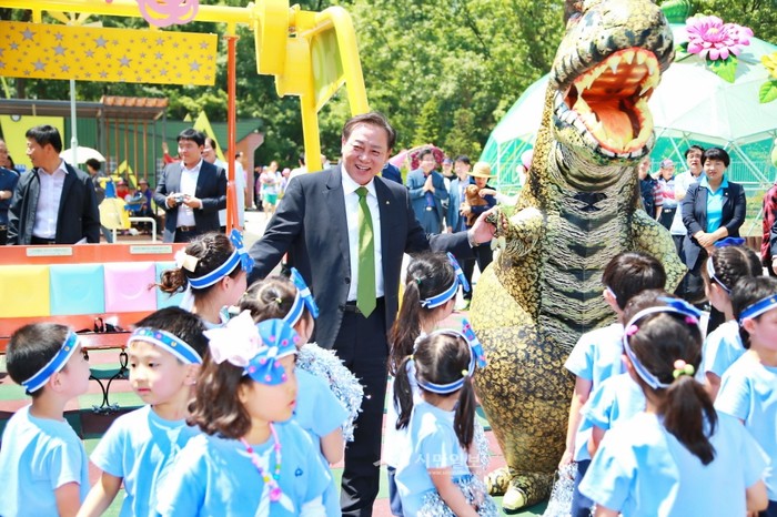 금천구 시흥5동 주민자치위원회와 주민들이 지난 27일 시흥계곡 복합환경생태공원에서 공원 개장을 축하하는 주민한마당 축제를 개최해 차성수 금천구청장(가운데)이 어린이들과 함께 공원개장을 축하하고 있다. (사진제공=금천구청)