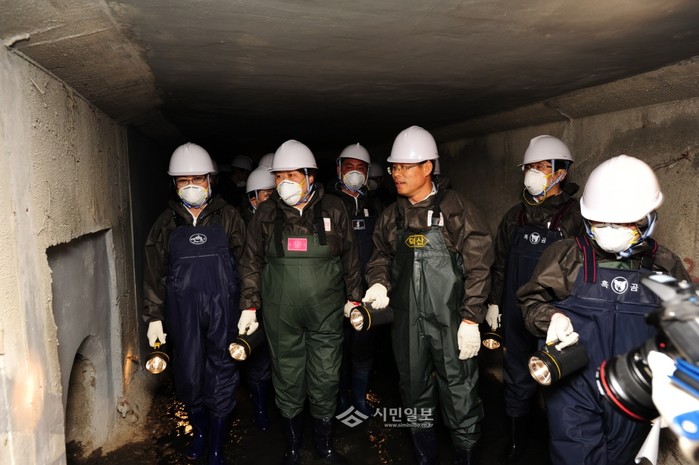 지난 26일 하수관거 관리상태와 안전점검을 위해 서울 구로구 오류동에 위치한 럭비구장 인근의 하수관거를 방문한 김명조 의장, 곽윤희·김희서·박칠성·최숙자·정대근·김영곤 도시건설위원회 위원들이 하수관거 점검을 실시하고 있다.(사진제공=구로구청)