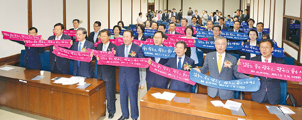 28일 오전 서울 여의도 국회도서관 소회의실에서 열린 ‘국회 광주유니버시아드대회 지원단 발대식’에서 새정치민주연합 문재인 대표, 윤장현, 김황식 광주유니버시아드 조직위 공동위원장 등 참석자들이 대회 성공을 기원하는 퍼포먼스를 하고 있다.