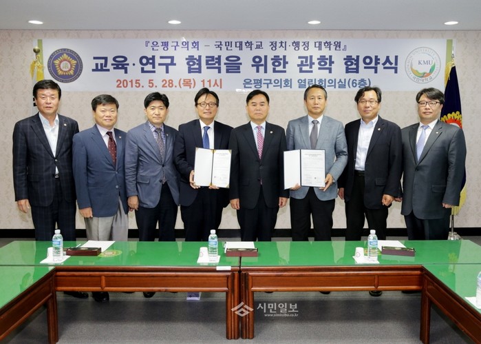 서울 은평구의회는 최근 구의회 열린회의실에서 국민대학교 정치·행정대학원과 교육 및 연구협력을 위한 협약식을 가졌다. 양기관은 의정활동 자료와 대학 연구성과물 상호 공유로 지방자치의정을 발전·모색하고, 학문과 실무에 강한 정치·행정지도자 양성과정을 지원하기로 했다. 사진은 장창익 의장(가운데)을 비롯한 관계자들의 모습.