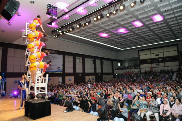 최근 서울 동대문구청에서 열린 '2015년 동대문구 어르신문화축제'에서 동춘서커스단이 노인들의 박수 속에서 의자를 이용한 서커스 공연을 펼치고 있다.(사진제공=동대문구청)