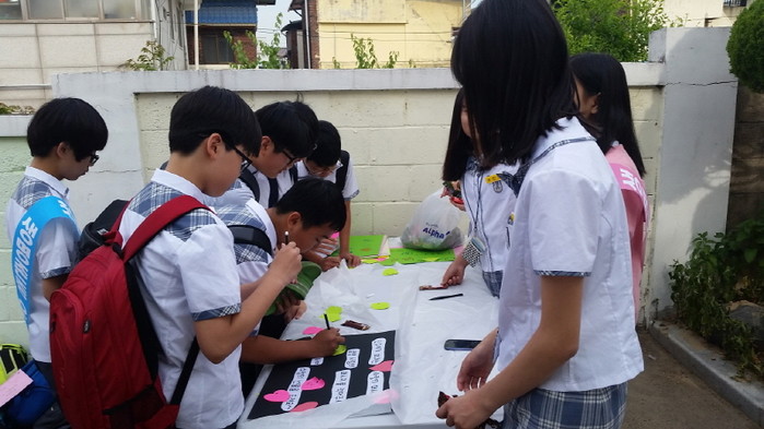 경북 구미시 인동중학교가 최근 등교하는 교직원 및 학생들을 대상으로 '학교폭력 예방 및 생명존중 캠페인'을 실시해 학생들이 '친구 사랑 메시지 전달'을 위해 메모를 작성하고 있다.(사진제공=구미교육지원청)