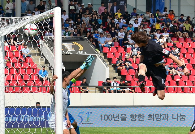 절호의 기회를 놓친 이후 바로 위기가 찾아왔다. 후반 5분, 전북의 윤창현이 상대 골키퍼 전상욱이 쳐낸 헤딩슛을 몸을 날리며 골문으로 우겨넣어 선제골을 터뜨렸다.