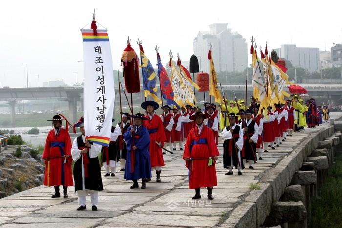 최근 성동구 살곶이다리에서 600년 전 이 다리를 지나 응봉산으로 매 사냥을 나가곤 했던 태조 이성계의 사냥 행차를 재연하는 행사가 열려 펼쳐지고 있다. (사진제공=성동구청)