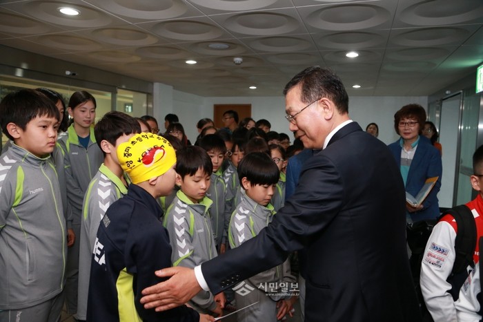 장만채 전남도교육감(오른쪽)이 최근 제주도에서 열린 제44회 전국소년체전 현장을 방문해 수영 종목에 출전하는 선수들을 찾아 격려하고 있다.(사진제공=전남도교육청)