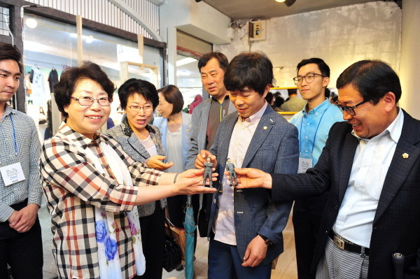 홍미영 인천 부평구청장(왼쪽)이 최근 부평시장로터리 지하상가에서 열린 '제2기 청년문화상점 부평로터리마켓 개소식'에 참석해 박종혁 부평구의회 의장(가운데), 관계자들과 함께 상가에서 판매될 소품을 구경하고 있다.(사진제공=부평구청)
