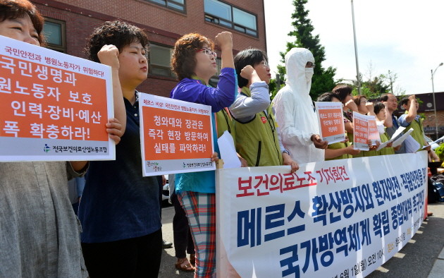 1일 오전 서울 종로구 청운동사무소 앞에서 열린 ‘메르스 확산 방지와 국가방역체계 구축 위한 특별대책 촉구 기자회견’에서 전국보건의료산업노동조합 관계자들이 메르스 대응 범정부 종합대책기구 구성을 촉구 하고 있다.