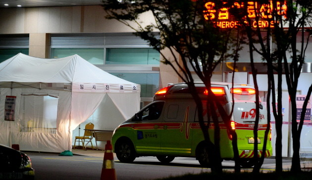 1일 오후 중동호흡기증후군(메르스) 의심 환자가 사망한 것으로 알려진 경기도의 한 대형 병원 응급실로 구급차가 도착하고 있다. 응급실 입구엔 질병관리본부 지침에 근거한 임시진료소가 설치돼 있다.