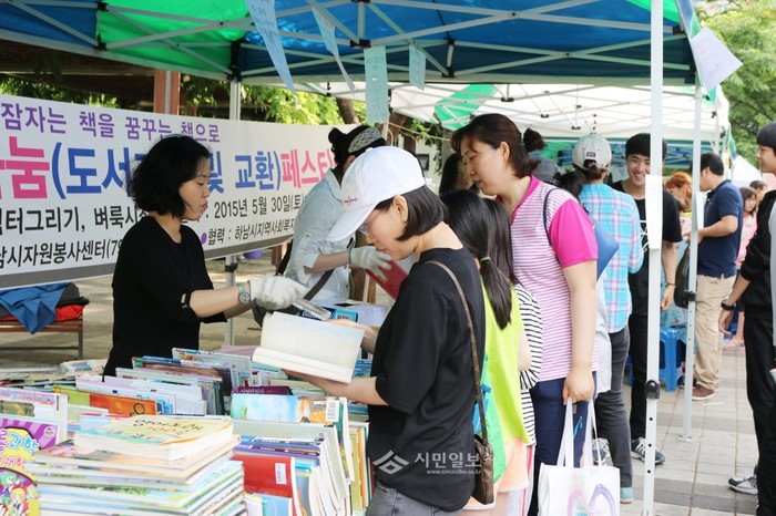 경기 하남시자원봉사센터가 최근 시청 앞 근린공원에서 책 읽는 문화 확산을 위해 '사랑의 책 나눔 페스티벌' 행사를 개최해 참여 시민들이 기부된 책들을 둘러보고 있다.