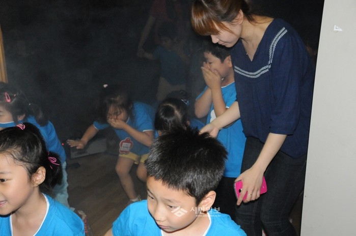 지난 2일 서울 서대문소방서가 소방서에서 홍제초등학교 병설유치원 어린이 및 교사들을 대상으로 소방안전교육 및 화재대피훈련을 실시했다. 사진은 연기체험실에서 대피훈련을 하고 있는 아이들의 모습. (사진제공=서대문소방서)