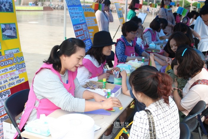 경기 고양시원당종합사회복지관이 최근 화정역 문화광장에서 지역여성이 주체가 되는 재능나눔행사를 진행해 참여 여성들이 북아트 체험 부스를 운영하고 있다.(사진제공=고양시청)