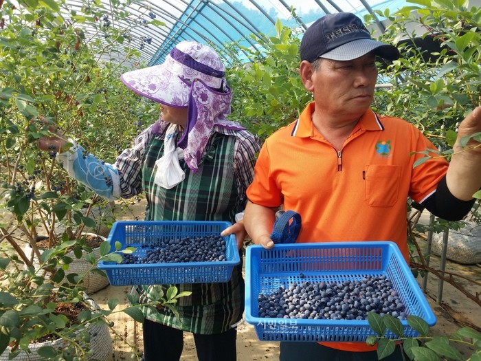 지난 3일 장흥군 회진면의 한 농가에서 블루베리 수확이 한창 진행돼 농가 하우스에서 농민들이 블루베리를 따고 있다. 블루베리는 안토시아닌 성분이 풍부해 눈 건강에 좋고 노화방지에도 효과가 있는 것으로 알려져 있다.(사진제공=장흥군청)