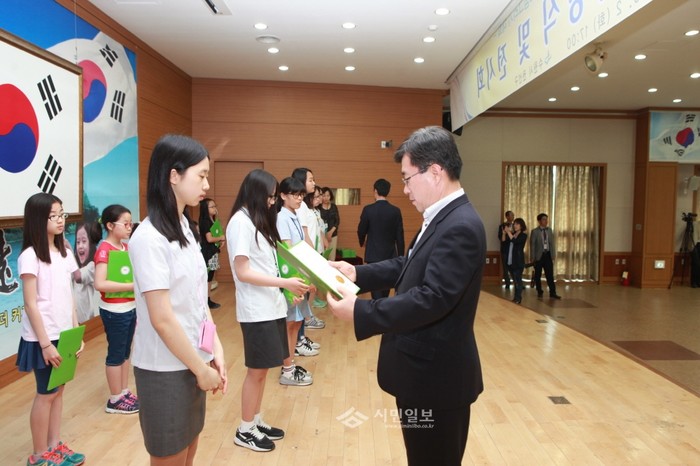 수원시 권선구가 지난 2일 권선구청에서 '황구지천 생태환경 축제 글짓기, 그림그리기 대회' 입상작품에 대한 시상식을 개최해 박흥수 권선구청장(오른쪽)이 학생들에게 상장을 전달하고 있다.(사진제공=권선구청)