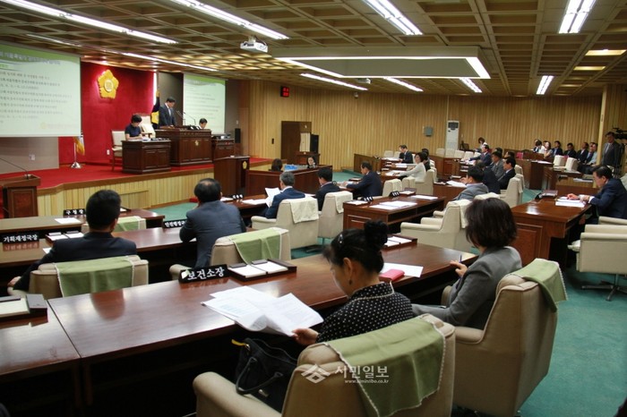 서울 강서구의회가 3일 '제231회 임시회'를 개회해 이연구 의장 및 의원들이 이날 열린 제1차 본회의에 참석해 회의를 진행하고 있다. (사진제공=강서구의회)