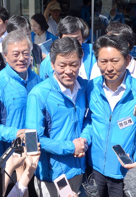 3일 오후 경기도 양평군 가나안농군학교에서 열린 ‘새정치민주연합 의원단 워크숍, 원탁토론’을 마친 뒤 주승용(가운데), 정청래(오른쪽) 의원이 취재진 질문에 답하던 중 악수를 하고 있다. 왼쪽은 문재인 대표.