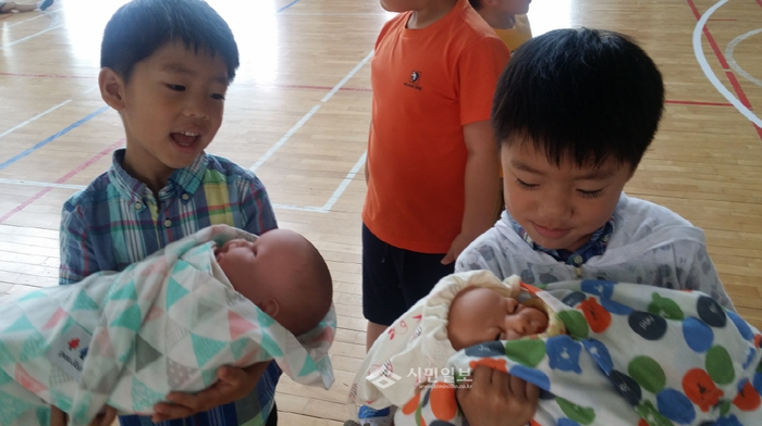 충남 아산 탕정초등학교가 최근 병설유치원 원아들을 대상으로 생명존중 체험활동인 '성교육 및 성폭력 예방교육'을 실시해 참여 어린이들이 직접 신생아 인형을 안아보는 체험을 하고 있다. (사진제공=아산교육지원청)