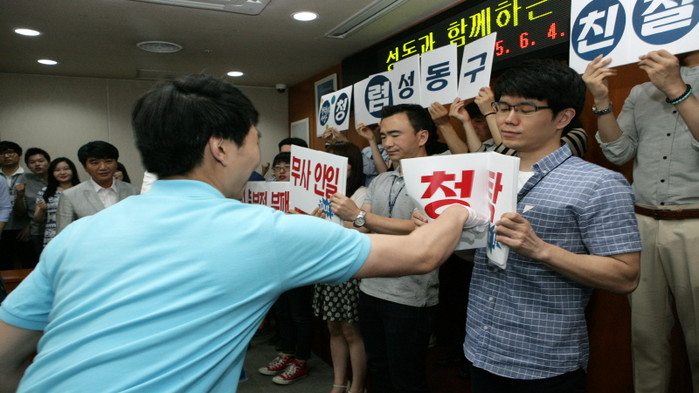 4일 서울 성동구가 4일 새내기 공무원들을 대상으로 실시한 역량 교육에 참여한 공무원들이 '청렴, 친절 UP, 부정부패, 청탁 DOWN 퍼포먼스'의 일환으로 '청탁'이라는 문구가 적힌 판넬을 부수고 있다. (사진제공=성동구청)