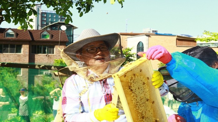 지난 3일 서울 관악구가 청룡산 마을텃밭 부근에서 주민들과 함께하는 꿀 채취 체험행사를 연 가운데 유종필 구청장이 행사에 참여해 직접 양봉작업을 펼치고 있다. (사진제공=관악구청)