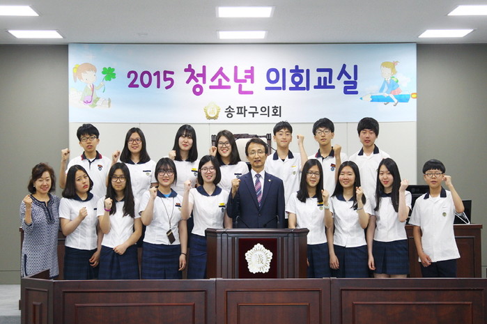 최근 서울 송파구의회에서 오주중학교 학생 임원진을 대상으로 실시된 ‘청소년 의회교실’에 참석한 노승재 서울 송파구의회 부의장이(가운데) 의회교실을 마친 학생들과 함께 기념촬영을 하고 있다. (사진제공=송파구의회)