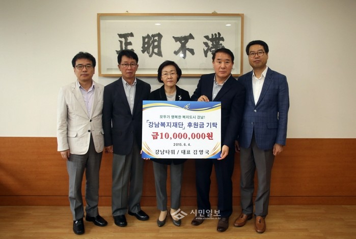 최근 강남구청에서 신연희 구청장(가운데)이 김영국 강남타워 대표(오른쪽에서 두번째)로부터 강남복지재단 후원금을 전달받고 함께 기념촬영을 하고 있다. (사진제공=강남구청)