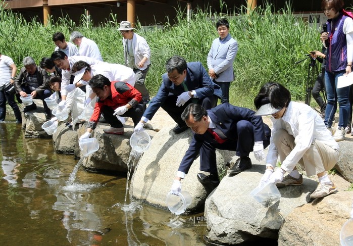 서울 서대문구의회 류상호 의장과 홍길식 부의장, 이진삼·이기수·박경희·이경선·김혜미 의원은 최근 홍제천 폭포마당에서 열린 '2015년 환경의 날 기념행사'에 참석했다. 사진은 치어방류 행사에 참여한 서대문구의회 의원들의 모습. (사진제공=서대문구의회)