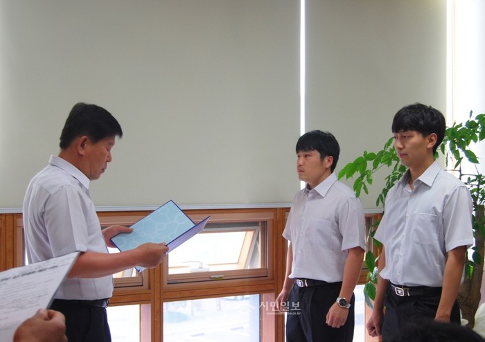 우근제 경기 양주소방서 서장(왼쪽)이 최근 신속한 응급구조로 시민의 생명을 살려 경기도 하트세이버로 선정된 조현진 소방교, 김재영 소방사에게 하트세이버 인증서를 수여하고 있다.(사진제공=양주소방서)