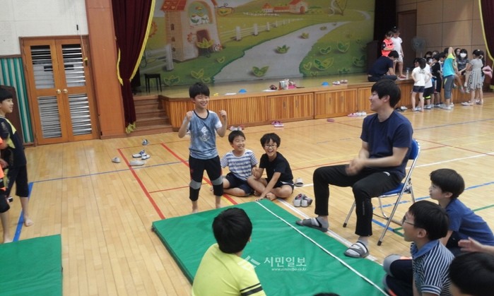 경북 구미시 옥계초등학교가 최근 4~6학년 학생들을 대상으로 체력측정을 실시했다. 사진은 한 어린이가 제자리 멀리뛰기를 하기 위해 매트 앞에서 준비하고 있는 모습.(사진제공=구미교육지원청)