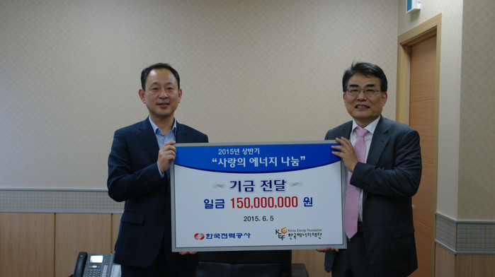 한국전력(사장 조환익)은 전 직원들의 자발적인 기부금과 회사의 지원금을 더해 마련한 1억 5천만원의 기금을 지난 5일 한국에너지재단에 전달하고, 8일부터 오는 7월 10일까지 주변의 어려운 이웃에게 전기요금을 지원해 주는 ‘사랑의 에너지 나눔’ 사업을 전개한다.
