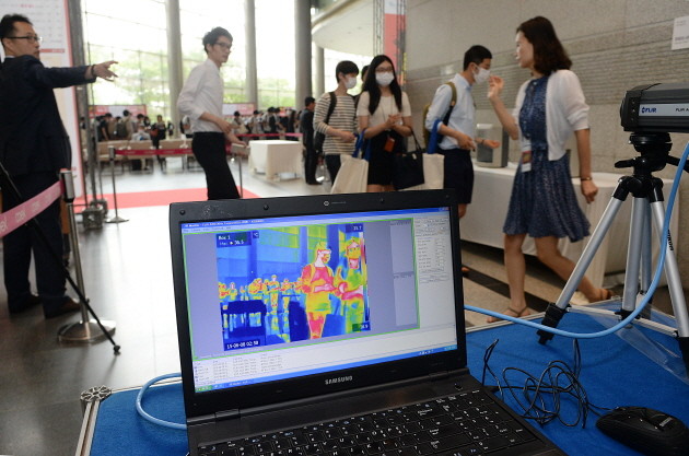 중동호흡기증후군(MERS·메르스)에 대한 불안감이 확산되고 있는 가운데 8일 오전 서울 강남구 삼성동 코엑스에서 열린 '스펙깨기 능력중심 채용박람회'를 찾은 구직자들이 입구에서 손 소독 및 열감지카메라 확인 후 입장하고 있다.