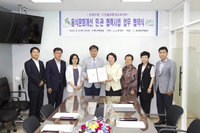 서울 은평구는 최근 구청장실에서 (사)블루환경과 2015년 음식문화개선사업 추진을 위해 업무 협약식을 열었다고 밝혔다. 사진은 협약식에 참석한 김우영 구청장(가운데)을 비롯한 관계자들의 모습.(사진제공=은평구청)