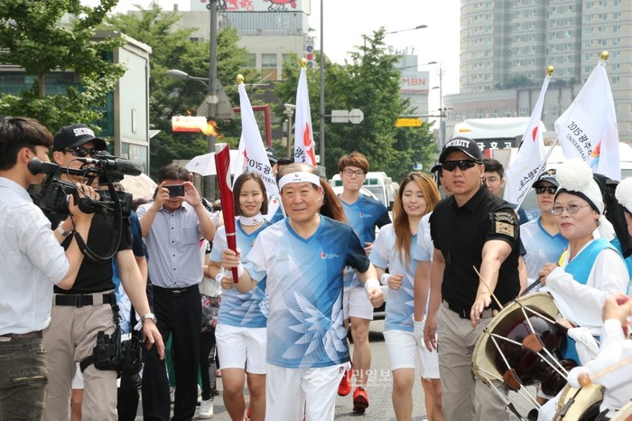 박홍섭 마포구청장(가운데)이 최근 합정역에서 진행된 '2015 광주유니버시아드' 성화봉송 행사에 참석해 성화를 봉송하며 대회의 성공을 기원했다. (사진제공=마포구청)