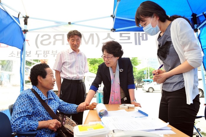 홍미영 인천 부평구청장이 최근 부평구보건소를 방문해 메르스 확산 방지에 만전을 기할 것을 지시했다. 사진은 홍미영 구청장(가운데)이 구 보건소에 마련된 메르스 진료소를 찾은 한 노인을 위로하고 있는 모습.(사진제공=부평구청)