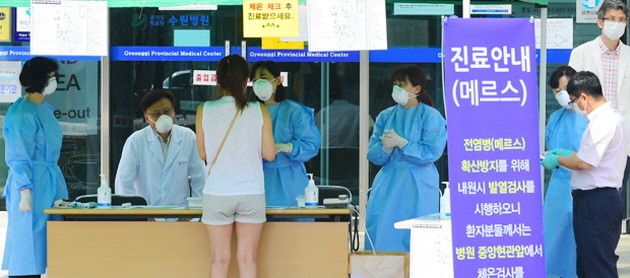 전국 최초로 메르스(MERS·중동호흡기증후군) 환자만을 진료하는 메르스 전담병원인 경기도의료원 수원병원이 가동을 시작한 가운데 10일 오전 메르스 증상을 보이는 시민들이 수원병원 현관앞에 마련된 임시진료소에서 문진하고 있다.