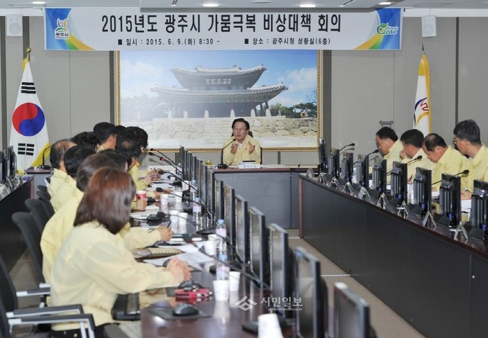 경기 광주시는 최근 시청 상황실에서 조억동 시장의 주재로 가뭄극복 비상대책 회의를 농정과 등 관련 부서장 26명이 참석한 가운데 개최했다. 사진은 이날 회의에 참석한 조억동 시장(중앙)과 관계자들의 모습.(사진제공=광주시청)