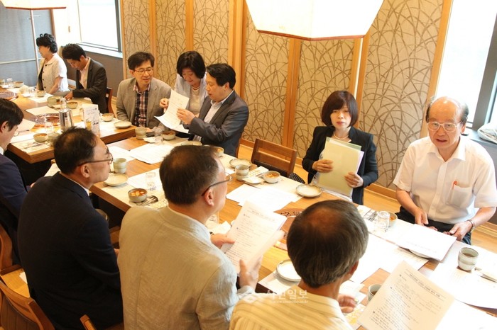 지난 10일 구로구가 메르스 방지를 위한 토의를 위해 개최한 의약인 단체 간담회에 참가한 구로구약사회가 이성 구청장, 구 관계자들과 함께 메르스 특성과 전염차단 방법 등을 논의하고 있다. (사진제공=구로구청)