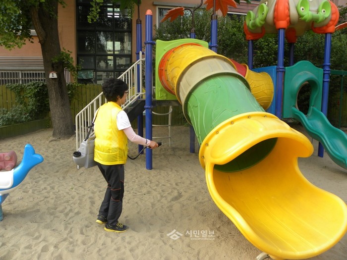 도봉구가 최근 중동호흡기증후군(메르스) 공포로 어린이집 등원을 망설이는 학부모의 걱정을 덜기 위해 지역내 전체 어린이집에 대해 긴급 실내외 방역 소독에 나선 가운데 실외놀이터를 대상으로 방역소독을 진행하고 있는 모습이다. (사진제공=도봉구청)