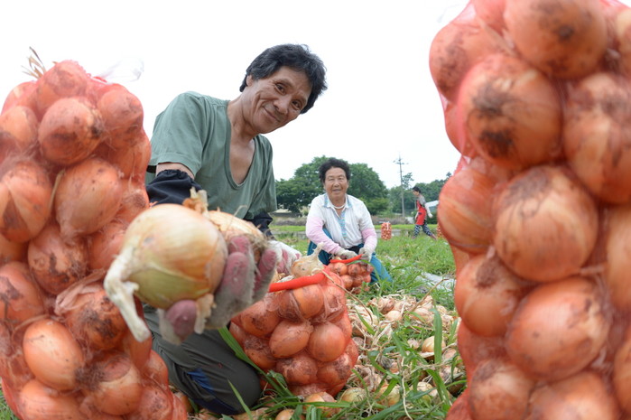 11일 경남 거창군 거창읍 월천지역의 양파 논에서 고창식씨(58)가 노모와 함께 양파 수확을 하고 있다. 청정지역인 거창에서 자란 양파에는 각종 황산화 물질과 비타민C가 풍부해 면역력을 높여 주는 것으로 알려 졌다./뉴시스