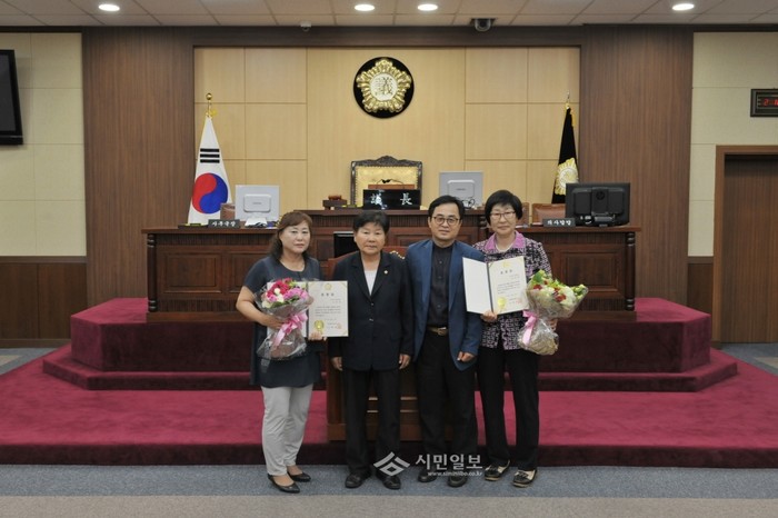 서울 영등포구의회가 11일 의회 본회의장에서 영등포구 모범시민 표창장 수여식을 연 가운데 박정자 의장과 모범시민으로 선정된 강순화, 이옥희씨가 수여식 후 함께 기념촬영하고 있다.