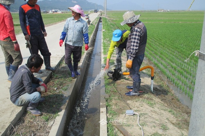 인천 강화군 삼산면 상리 청년회가 최근 계속되는 가뭄에 지역내 논과 밭에 물을 대기 위해 해결책을 마련하고 나선 가운데, 직접 지하수를 개발해 물을 끌어올리고 있다.(사진제공=강화군청)