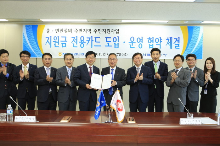 한국전력(사장 조환익)은 6월12일 농협은행(은행장 김주하)과 함께 송변전설비 주변지역 주민공동지원사업·지원금 전용카드의 성공적 도입 및 안정적인 사업운영을 위한 협약을 체결했다.