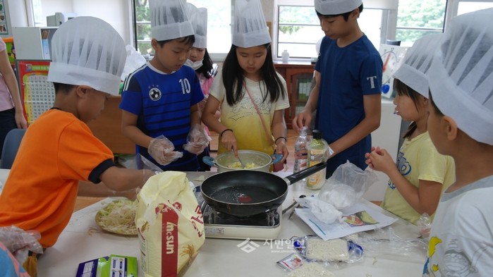 경기 여주시 강천초등학교는 최근 '강천 육남매가 함께하는 요리 월드컵'을 개최했다. 사진은 이날 행사에 참여한 학생들이 육남매로 짝지어져 함께 요리하고 있는 모습.