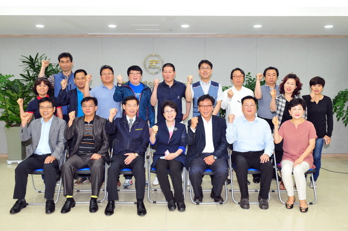 홍미영 인천 부평구청장이 최근 '문화관광형 시장 선정 및 크루즈 관광객 유치에 노력한 공'을 인정받아 부평지하상가로부터 감사패를 전달받았다. 사진은 전달식에서 홍 구청장(앞줄 가운데)과 지하상가 상인회 관계자들과 함께 기념촬영한 모습. (사진제공=부평구청)