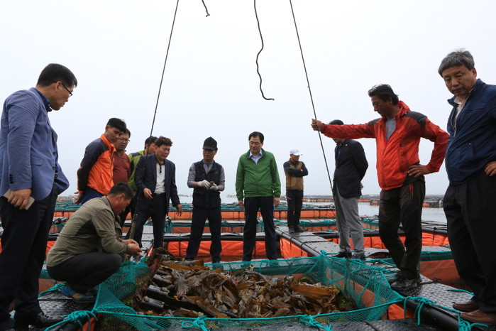 신우철 전남 완도군수가 최근 생일면 덕우도를 방문해 주민들과 격의 없는 대화를 나누고 전복가두리 등 어업현장을 점검했다. 사진은 전복가두리 어업현장을 방문한 신 군수(가운데)의 모습. (사진제공=완도군청)