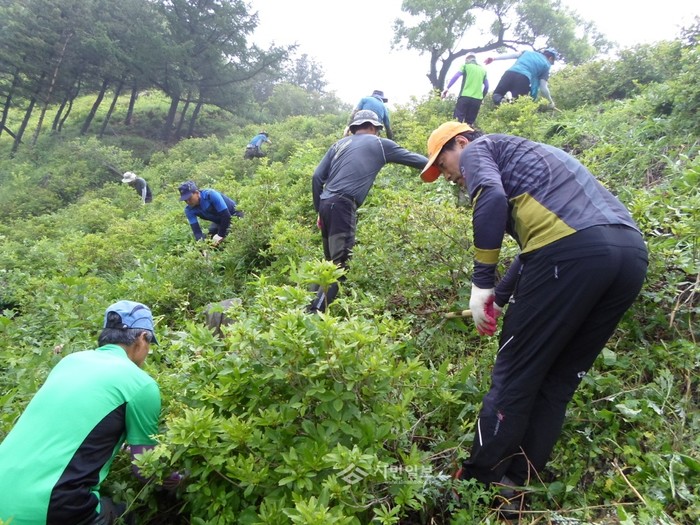 경기 포천시 내촌면에서는 최근 쾌적하고 아름다운 등산로 조성을 위해 주금산 정상 철쭉동산에 번진 잡풀 제거 작업을 실시했다. 사진은 이날 정비활동에 나선 관계자들이 잡풀을 제거하고 있는 모습.(사진제공=포천시청)