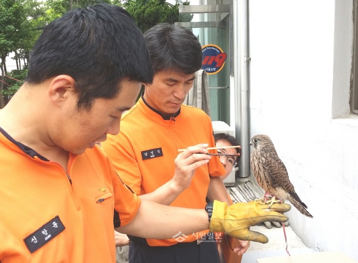 서울 동대문소방서는 지난 14일 오전 장안동 한 건물에서 황조롱이를 구조했다. 사진은 이날 구조에 나선 소방대원들이 황조롱이에게 먹이를 주고 있는 모습. (사진제공=동대문소방서)