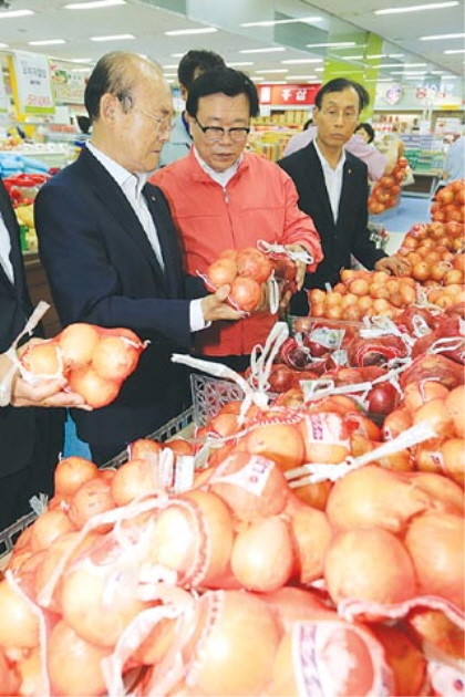이동필 농림축산식품부 장관이 15일 오후 메르스로 인한 소비 위축을 해소하기 위해 서울 관악구 신림동 농협하나로마트를 방문, 농산물 유통실태와 메르스관련 소비동향을 점검하고 있다.