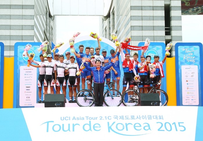 최근 서울 송파구 올림픽공원 평화의 문 광장에서 전세계 각국에서 온 20개팀 200여명의 선수단이 참가한 ‘국제 도로 사이클 대회(Tour de Korea) 2015’ 행사에 참석한 임춘대 의장이 수상자들과 함께 기념촬영을 하고 있다.(사진제공=송파구의회)