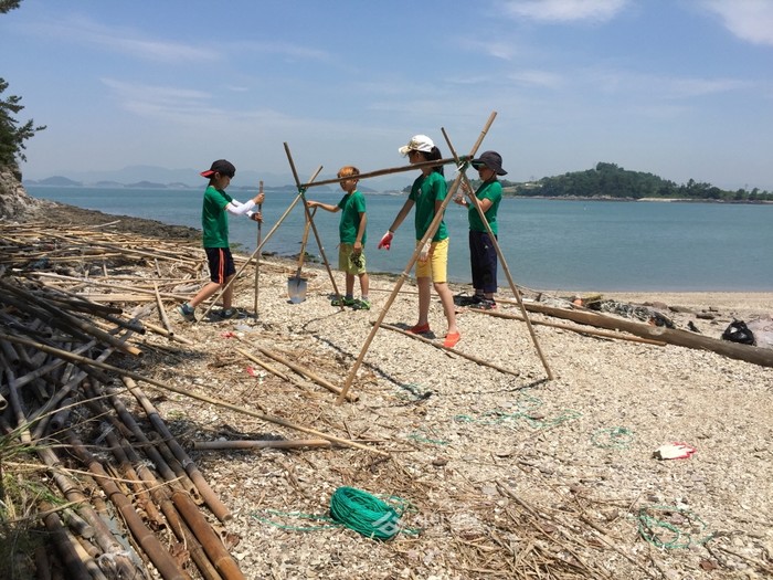 전남 광양 골약초등학교가 최근 전교생이 참여하는 역량강화 체험활동 프로젝트를 진행했다. 사진은 참여 학생들이 매물섬에서 무인도 원시체험을 하며 직접 잠을 잘 집을 짓고 있는 모습. (사진제공=전남교육청)