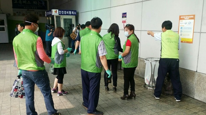 지난 15일 경기 수원시 권선구보건소 관계자들과 자원봉사자들이 메르스 확산 방지를 위해 수원버스터미널 대합실과 화장실 등을 대상으로 알콜소독을 실시하고 있다.(사진제공=권선구보건소)