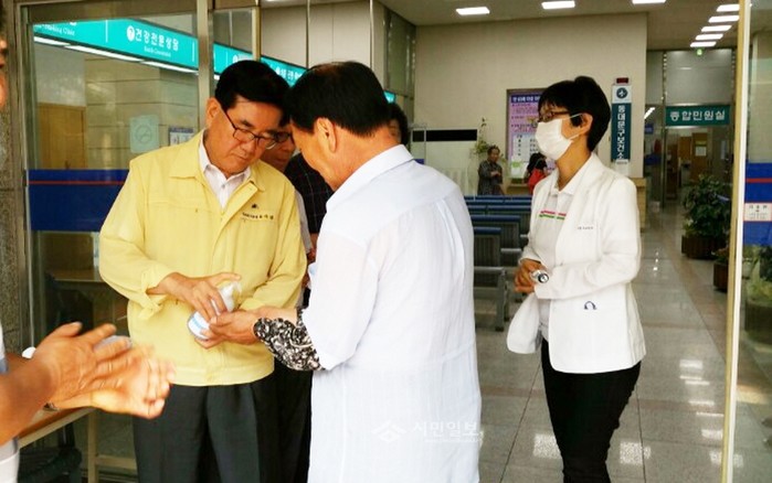 지난 16일 오전 동대문구보건소 앞에서 유덕열 동대문구청장(왼쪽)이 보건소를 방문한 주민들에게 메르스 예방을 위해 손 세정제를 제공하고 있다. (사진제공=동대문구청)